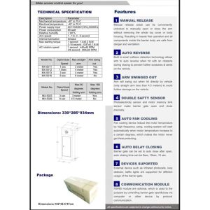 Spesification: -Mesin AC -Material dimensions (LXDXH) in mm =2mm cold Roll steel sheet IP54 320x280x935. -Operating ambient temperture -20C to +55C. -Housing Colour: Orange -Net Weight =65Kg -Rate Power =120W -Machine Core =WS1 -Operation Times = Ready speed 1.8 detik / 3 detik -Lenght = Palang 3M (1.8s), Palang 4M (3s) & Palang 6M (6s)